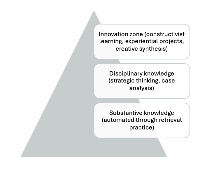The answer lies in recognising a simple principle. Students cannot innovate if they cannot remember what they need to think with. Substantive knowledge such as theories, frameworks and models must be secure. Disciplinary knowledge, including how to analyse cases or critique strategies, depends on this first layer.